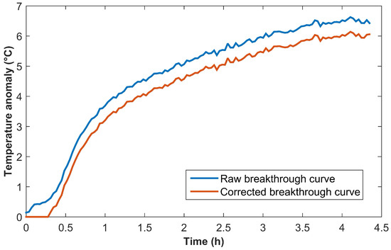 To quantitatively remove the temperature signal due to thermal losses along the tube from the raw FO-DTS measurements, we used a very simple method. During a single-well thermal tracer test with continuous injection, the temperature signal visible at first is the heat losses along the injection tube before the arrival of the thermal breakthrough. We supposed that the temperature of those heat losses becomes rapidly constant as advection processes along the tube cools this conductive signal and limits transversal conduction in the borehole [49]. The signal measured before thermal breakthrough arrival can thus be considered as a "temperature background" that does not vary with time. Then, we directly subtract this constant background temperature to the measured temperature to extract the thermal breakthrough of the tracer tests.