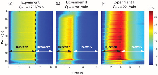To illustrate the influence of flow rate and flow configuration on thermal recovery, the raw FO-DTS measurements during Experiment I, II and III are compared using the same color scale in Figure 8. This figure shows that temperature signal is more attenuated when the flow rate increases, which is simply due to an increase of thermal dilution with the flow rate. For each experiment, the high temperature signal from thermal tracer breakthrough can be localized at 34 m. This heat inflow is much more visible for high flow rates (Figure 8a,b) as thermal losses signal along injection tube have less influence on temperature records due to thermal dilution.