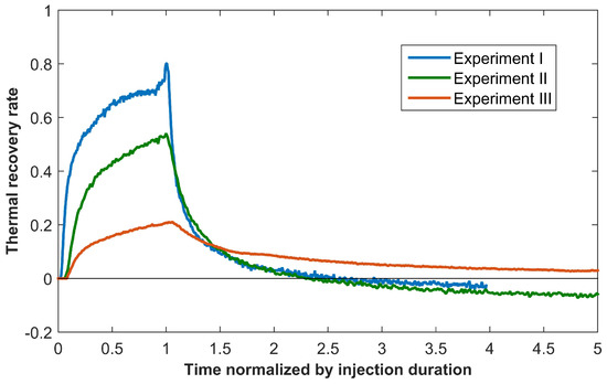 Thermal recovery rate for the different experiments as a function of the time normalized by the injection duration at B3-1A depth (34 m).