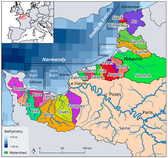 Domain of the study: the river networks adjacent to the Normandy and Hauts-de-France coastlines; and the Seine Bight and the English Channel (16 km × 16 km) where the GRAFS- RIVERSTRAHLER and ECO-MARS3D models were respectively implemented. The names of the watershed (black shaded with white) and the stations (black) used for validation are indicated.