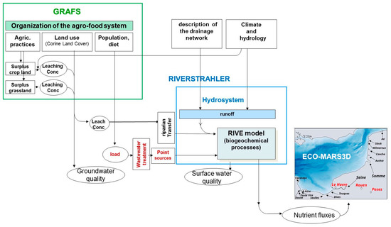 Three types of models were developed and then chained during this project: (i) a regional agro-food system model linking food production in the watershed to nutrient losses to surface water; (ii) a river network model able to provide nutrient flows at the outlets of the main rivers and streams; and (iii) a model of the coastal marine ecosystem, fed by these riverine flows of nutrients and making it possible to simulate the temporal and spatial distribution of microphytoplankton. Until now, the model chain was essentially applied to the single drainage network of the Seine River [32,34,38], but here the river model was extended to all the coastal rivers of Normandy and Hauts-de-France (Figure 1).