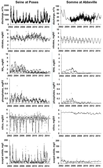 Changes in wastewater treatment over the past decade (implementation of nitrification, then denitrification [64]) explain the inter-annual variations in ammonium. Inaccuracies in the documentation of these changes in our database probably led to the dispersion of the observed values around a general trend that was correctly reflected by the model, however, except at the end of the period studied, when the simulation was not as good (Figure 3). Seasonal and inter-annual variations in total P are mainly related to urban inputs from wastewater treatment plants (WWTPs) and notably changed during the period studied with improved WWTP processing [65]. These changes over the 2002–2014 period complicated the model results for both ammonium and P because input provided by the water agencies was not necessarily robust in this moving context. The overall percentage of variation was higher on the Seine where major changes occurred than on the Somme (NRMSE = 41% and 7%, respectively), while no significant systematic bias was observed (7% and −28%).