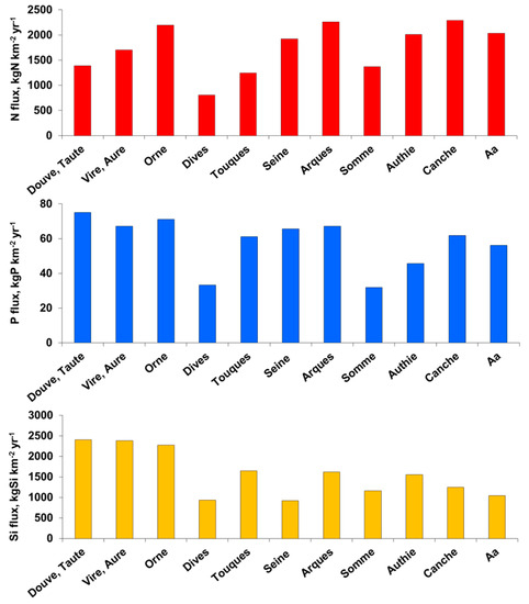 Specific nutrient fluxes at the outlets of the rivers studied and averaged for the reference period, 2002–2014 (total N, P, and Si in kg km−2 y−1).