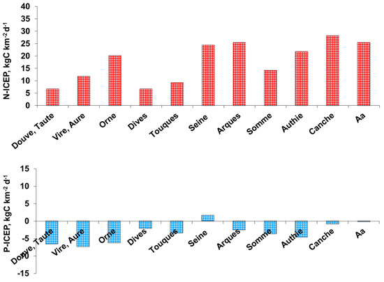 In complement to the absolute value of the N, P, and Si fluxes, specific fluxes per km² of surface area allow one to visualise the human pressures over the basins in a comparative view (Figure 4). Except for the Somme basin, all coastal rivers of the Hauts-de-France coast tended to show higher N pressure than the Normandy rivers, with the exception of the Orne River, reflecting the more intensive agriculture in Hauts-de-France than in Normandy. Conversely, P pressure would seem to be lower for Hauts-de-France rivers than for Normandy rivers. Overall, the differences in specific fluxes varied at a ratio of 2.8 and 2.4 for N and P, respectively. The ICEP (indicator of coastal eutrophication potential) [14,16,66] calculates the nitrogen (N-ICEP) or phosphorus (P-ICEP) excess in regard to Si with respect to diatom growth requirements according to stoichiometry [67,68]; it is expressed in mgC per day and per km² of catchment area and, therefore, corresponds to the amount of non-siliceous algal biomass likely to be produced after Si has been exhausted. The risks of eutrophication are limited when the ICEP takes values that are close to zero or negative (Figure 5). Interestingly, N-ICEP was systematically largely positive for all the rivers, indicating a strong eutrophication potential due to an N excess over the area studied. In contrast, except for the Seine River, P seems not be in excess in regard to Si, as indicated by negative P-ICEP values, with P the limiting element.
