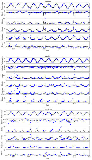 To ensure that the ECO-MARS3D model correctly represents the environmental conditions at the chosen resolution of 16 km × 16 km, the main hydro-biological variables were compared to the measurements available at two stations in the Seine Bay (i.e., Géfosse and Antifer) and one near Dover Strait (Dunkerque) over the 2002–2012 period (see Figure 1). For these stations, simulated seasonal cycles as well as the levels of the major water quality variables (i.e., temperature, salinity, nutrients, chlorophyll) were in good agreement with the observations over the entire period, even if greater differences existed for some years (2003 in particular) (Figure 6).