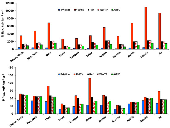 The modelling approach of the GRAFS-RIVERSTRAHLER model made it possible to evaluate the effects on riverine nutrient fluxes (averaged over the 2002–2014 period) delivered to coastal areas for the five scenarios constructed (Figure 8). The difference between the results for the Pristine and 1980s scenarios can be seen as two extreme situations, respectively, without human impact and with a maximum effect at a time when wastewater was collected in WWTPs but discharged without sufficient treatment. The 1980s also corresponded to a maximum amount of fertiliser, although the inertia of aquifers (not taken into account in these simulations) has probably partially masked the subsequent evolution, since equilibration between soils and aquifer was probably not reached. Therefore, the 2002–2014 reference period studied (Ref scenario) was more marked by measures related to point source pollution, i.e., a completion of WWTP upgrading for P (dephosphatation) and N treatments (nitrification and denitrification). A pursuit of wastewater treatment improvement (see the WWTP scenario) would no longer have much effect on N and P fluxes, both because this upgrading was already largely effective (see Ref scenario) and because diffuse N inputs dominated over point inputs, while point P sources decreased to the level of the P diffuse inputs, rather low in this lowland region with small erosion [70]. With the A/R/D scenario, N flux would indeed be lowered by a further 20% and would decrease the N-ICEP risk of eutrophication by 30% (Table 7). This indicates that, to go further in reducing N diffuse inputs, more radical changes in the entire agri-food chain would be necessary. Regarding P, a 22% flux decrease could be, however, expected from the WWTP scenario, without further changes for the A/R/D scenario, which only concerned N. The P-ICEP, still positive at the outlet of the Seine for the Reference situation (i.e., 1.7 gC km−2 d−1, approaching zero, compared to 10.3 gC km−2 d−1 for the 1980s scenario), switched to below zero for a full compliance of the UWWD EU [37] (WWTP scenario), indicating a good P:Si nutrient balance and, hence, no risk of eutrophication with respect to P (Table 7).