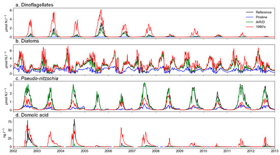 Whereas inter-annual fluctuations differed in terms of the dinoflagellate biomass between 2002 and 2014, with a decrease since 2007 (see the Reference situation curve, Figure 9), the diatom biomass fluctuated around 4 µmol N L−1 with a contribution of about 25% PSN, which episodically produced DA, with the highest concentrations in 2002 and 2004 (20 and 50 ng L−1, respectively) and low values for the other years (<5 ng L−1). In the Pristine scenario, dinoflagellates did not develop, and the diatom biomass was reduced by a factor of 2, while the proportion in PSN remained the same. However, no productio of DA was shown. The 1980s scenario showed a large increase in dinoflagellates, especially during the middle half of the period studied, following the seasonal trend of the Ref scenario. Whereas diatom biomass increased, PSN accordingly decreased, but produced more DA, probably because of a strong Si limitation. The A/R/D scenario, which would prevent dinoflagellates from growing, would maintain a diatom biomass level similar to the reference, including PSN, which did not, however, produce DA (Figure 9).