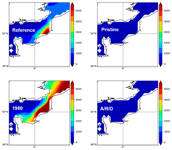 Although the simulated average spatial distribution of DA (cumulated over the period) showed higher values in the upper Normandy section, DA was spread over the entire coastline for the 1980s scenario, while values appeared very low in both the Pristine and A/R/D scenarios (Figure 10).