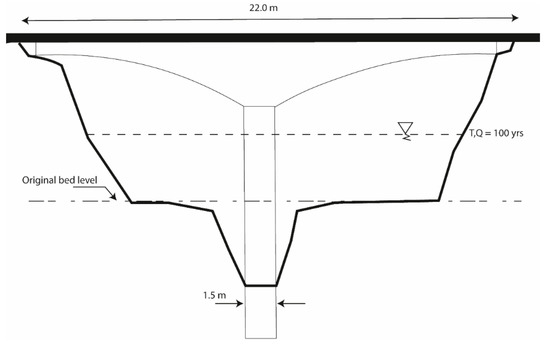 A simplified numerical case study is considered to evaluate how the choice of the formula for the temporal evolution of scour affects the bridge scour predictions. This case study consists of a two-span bridge with one submerged pier. The bridge-pier shape is cylindrical with a diameter of 1.5 (m) and the river cross-section with an average width of 22 (m). The channel slope is assumed having a value of 0.0001 (m/m), and the riverbed is considered as uniform sand with a grain-size diameter of 2.0 (mm). Therefore, the corresponding Manning coefficient value is . Figure 2 shows a sketch of the numerical case study considered for scour analysis.