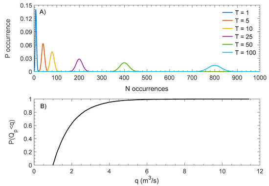 (A) Probability mass function of the number N of flood event occurrences with . (B) Empirical cumulative probability function of peak discharges for flood events with a magnitude .