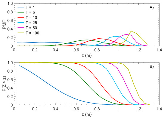 (A) probability mass function (PMF) of z in function of the considered bridge lifetime (T from 1 to 100 years). (B) Probability of exceedance of z in function of the considered time.