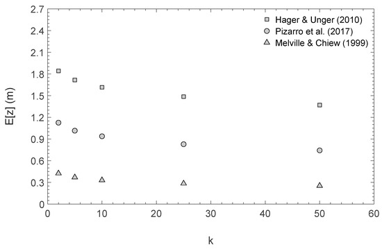 Figure 6 shows the expected scour depths according to the different temporal evolution models vs the hydrograph shape parameter k. The expected scour depth (E[z]) generally decreases by increasing k. The rate of decrease also reduces with k, until the rate of variation is almost zero for k = 50. Hager and Unger [30]’s formula provides the highest estimates for all the values of k considered, while Melville and Chiew [31]’s scour depths gives the lowest estimates. The ratio of the expected value of the scour depth for k = 50 with respect to the value for k = 2 is equal to 31%, 26%, and 11% for Hager and Unger [30], Pizarro et al. [33], and Melville and Chiew [31], respectively. Therefore, the trend of variation of E[z] is not the same for all the models.