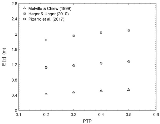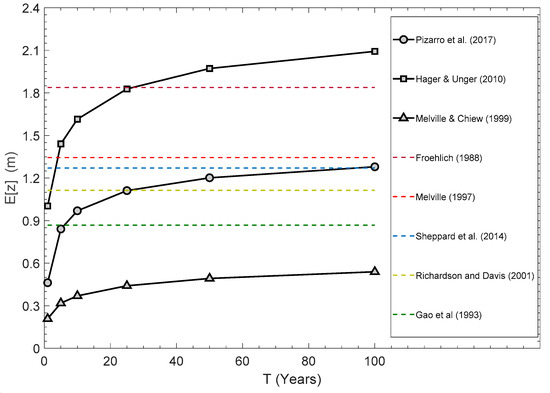 It can be observed that the scour depth according to Melville and Chiew [31]’s time-dependent scour equation is below all the computed equilibrium scour depths for the whole range of time. In turn, Hager and Unger’s [30] equation for T = 1 year reported a higher value than Gao et al. [43] for E[zeq]. Pizarro et al. [33] provided a scour depth value equal to Sheppard et al. [42], for T = 100 years, while Hager and Unger [30] computed the same scour value of Froehlich [40] for T = 25 years.
