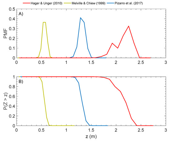 Figure 8A shows the PMF and Figure 8B shows the exceedance probabilities of the scour depth z for the various models, obtained assuming k = 2, PTP = 0.5, and T = 100 years. Melville and Chiew [31]’s and Pizarro et al.’s [33] models result in single peaked PMFs, while Hager and Unger’s [30] model results in PMFs with two peaks at z = 1.90 and 2.25 (m). The PMFs according to the various models are very different. For instance, the exceedance probability of the scour depth z = 1.32 (m) is 0% for Melville and Chiew [31], 50% for Pizarro et al. [33], and a 100% for Hager and Unger [30].