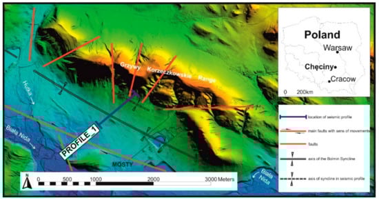 The axial part of the Bolmin syncline is located in the Mosty region [28,29]. Its axis has a WNW direction in this area. In the SW area of the Holy Cross Mountains Margin, a number of fault zones have been found, which are partially visible in the relief of this terrain (Figure 1). Most river valleys, including Hutka, Biała Nida, and Czarna Nida, are characterized by developed fault lines [28,30,31]. The largest fault zone stretches along a length of 15 km to the NW through the Mosty region to Czarna Nida to the south of Chęciny. It cuts the rocks of the Bolmin syncline and has the character of a dextral strike–slip fault [32,33]. The existence of smaller faults can be suspected on the basis of interpretation of the relief of Grzywy Korzeczkowskie (Figure 1). Gorges that cut the hill have been formed as a result of the tectonic activity. In this part of the Holy Cross Mountains, the relation of the relief with the tectonics and lithology of Quaternary bedrock is exceptionally readable [32].