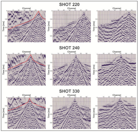 Shot gathers for shots 220, 240, and 330 with applied automated gain control (AGC) (100 ms). Left panels: shot gathers after diversity stacking. A carefully designated front mute (red line in left panels) removing linear refraction arrivals is presented in the middle panels. Right panels show the effect of applying normal move-out (NMO). Clear shallow reflections were visible at approximately 120 ms for shot 220, 110 and 140 ms for shot 240, and 100 and 150 ms for shot 330.