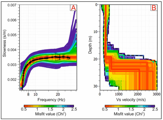(A) The uncertainty of the dispersion curve modeling. The picked dispersion curve (black line) with the uncertainty of picking was well fitted to the synthetic models (colored areas). The chi-squared parameter for the best theoretical curves was less than one; (B) 1D result of the multi-channel analysis of surface waves (MASW) analysis for shot 164. The 1D velocity model presented a uniform structure up to 18 metres. Below that depth, an increase of shear velocity (Vs) was visible. Interpretation of the deeper parts was impossible, due to the penetration range of the method.