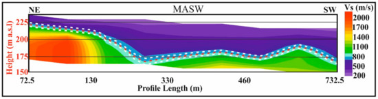 Both tomographic and reflection methods are poorly sensitive to potential low velocity zones, and also cannot image upper 10 m of the shallowest subsurface; therefore, the MASW method was applied. This analysis, widely used in geoengineering projects, can provide information about the shear velocity (Vs) field [24]. Furthermore, it can be used to estimate the geotechnical parameters of the soil.