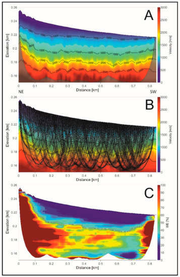 In total, 121 starting models were found to have adequate statistics for evaluating the uncertainty using hit-count normalization [44]. In this approach, the standard deviation normalized by the sum of rays in each cell was treated as the uncertainty estimator, called a weighted error (WE). Inversion was carried out for all 121 starting models of the velocity field. To find the optimal velocity field, the travel-time fitting was estimated as a ratio of chi-squared to the hit-rate—that is, the percentage of the picked travel-times for which synthetics were successfully obtained during two-point ray-tracing. The best travel-time fit was obtained for the model where V1 = 260 m/s and V2 = 1500 m/s. The inversion of this model was considered to be the final result of tomography. In the next step of the multi-method analysis, it was used as the subsurface velocity field and for correct front mute in reflection seismic imaging. Figure 5A presents the velocity distribution from inversion using JIVE3D code with the mask. The velocity field was rather smooth. The unconfirmed area (without sufficient ray coverage) has been greyed out.