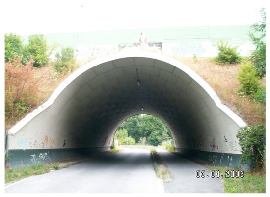 In road and bridge construction, there are many structures closely interacting with the soil, e.g., bridgeheads, concrete road culverts, retaining walls, integrated bridges, and soil–steel bridges (Figure 1). It is very important that the interaction between the soil and the structure is properly maintained in those structures. The current design of soil–steel bridges is based on adopting quite significant simplifications in their structural behaviour [1,2,3]. Consideration of the static and dynamic loads caused by service loads, as well as natural factors (earthquakes) and anthropogenic processes (rockbursts caused by mining and gas exploitation), are associated with the use of advanced computer programs. The existing standards and guidelines take into account the impact of seismic and anthropogenic loads on this type of bridge in a fairly general way [2]. Only the maximum design ground acceleration for which the structure should be designed is given in these standards.