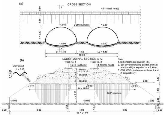 The influence of the use of EPS on a soil–steel bridge in Krosnowice, Poland subjected to seismic (El Centro) and anthropogenic (rockbursts coming from a coal mine) excitations was analyzed. This bridge consists of two identical spans of corrugated steel plate (CSP). These spans have a cross-sectional pipe-arch shape with lengths L1 = L2 = 4.40 m (Figure 2). The thickness of the steel plates is 0.003 m. The pitch and depth of corrugation are 0.15 m and 0.05 m, respectively. The height of the soil cover above the CSP shell is 2.40 m. The soil–steel bridge is 21.80 m long at the support and 16.00 m long at the shell crown.