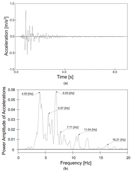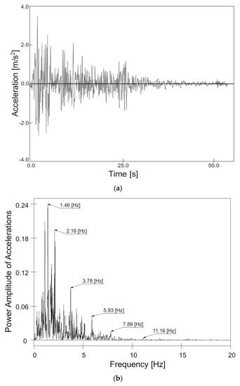 In this paper, the results of finite element (FE) analyses of the behavior of the soil–steel bridge subjected to seismic and anthropogenic excitations will be presented. The rockburst record from 12 December 2015 of the Upper Silesian Coal Basin was used (Figure 3). Additionally, the obtained results from the anthropogenic excitation (rockburst) were compared to the results obtained using the record of the El Centro earthquake from 18 May 1940 (Figure 4). The El Centro benchmark record was chosen for its wide spectral content and easy comparison with other results mentioned in the literature. Nevertheless, the best course would be to prepare a Monte Carlo response analysis with 100 Time History response analyses properly processed according to selected site properties. However, it is not the main purpose of the paper. In addition, a more rigorous analysis would require an approach presented, for example, by Bommer and Acevedo [23] and Iervolino and Cornell [24].