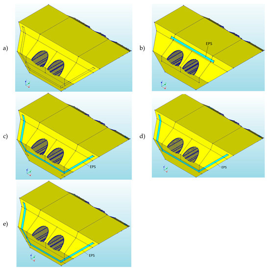 Numerical models of the soil–steel bridge with various locations of the expanded polystyrene (EPS) geofoam: (a) I, (b) II, (c) III, (d) IV, and (e) V.