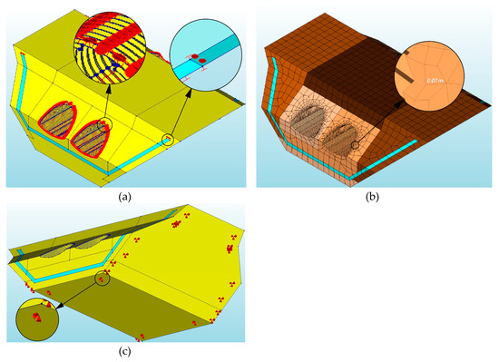 Figure 6. View of numerical model of the soil–steel bridge: (a) Connection-interface, (b) mesh, (c) boundary conditions (hinged supports).