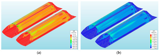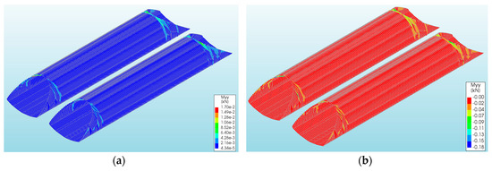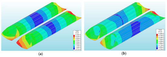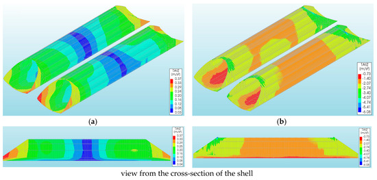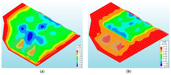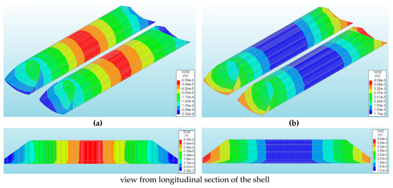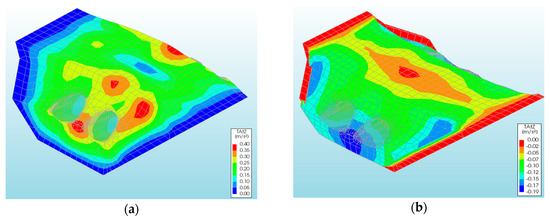 The overall level of vertical displacements caused by a rockburst and the El Centro earthquake was low (Table 1 and Table 2). The largest vertical displacements of the CSP shell were observed in models Vb and Va (Table 1 and Table 2) for the rockburst and El Centro excitations, respectively. They amounted to 4.04 × 10−3 m (Figure 7b) and were larger than the vertical displacements from the model Va (rockburst) by about 17 times (−2.32 × 10−4 m: Figure 7a).