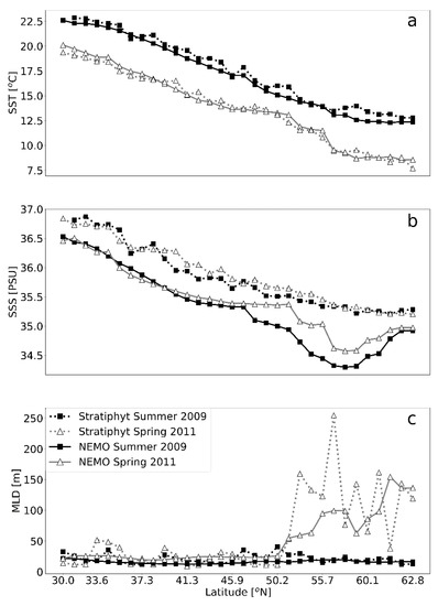 Sea surface temperature (SST) (a), sea surface salinity (SSS) (b), and mixed layer depth (MLD) (c), of Stratiphyt and NEMO (nucleus for European modelling of the ocean) run 1. Model results are April–May (2011) and July–August (2009) averages of stations shown in Figure 1.