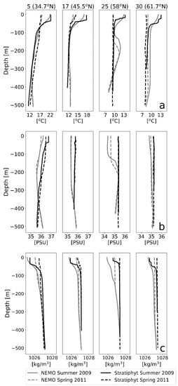 Temperature (a), salinity (b), and potential density (c) in the upper 500 m of Stratiphyt and NEMO (nucleus for European modelling of the ocean) run 1 at stations 5, 17, 25, and 30. Model results are April–May (2011) and June–August (2009) averages.