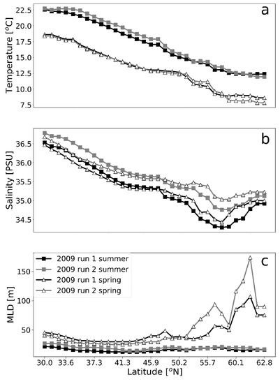 Sea surface temperature (SST) (a), sea surface salinity (SSS) (b), and mixed layer depth (MLD) (c) of NEMO run 1 and run 2. Model results are for spring 2009 (April–May averages) and summer 2009 (July–August averages).