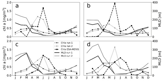 Monthly averages of surface chlorophyll a (Chl a, top 10 m) and mixed layer depth (MLD) of NEMO-PISCES (nucleus for European modelling of the ocean - pelagic interactions scheme for carbon and ecosystem studies) run 1 and 2, combined with monthly averaged remote sensing Chl a (Meris) for stations at 55.7º N (a), 58.7º N (b), 60.1º N (c), and 62.8º N (d) during 2009.