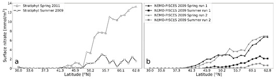 Summer and spring surface nitrate of Stratiphyt and NEMO-PISCES run 1 was depleted to on average 0.06 ± 0.10 mmol m−3 south of 43º N (Figure 6a). North of 43º N, observed surface nitrate concentrations increased to a maximum of 13 mmol m−3 in spring. Modelled (run 1) surface nitrate followed the same pattern, but with two-fold lower maximum concentrations (Figure 6b). Measured and modelled nitrate concentrations below 400 m were similar (not shown). Model run 1 and observed surface nitrate concentrations north of 45º N were in better agreement during summer, increasing to a maximum of 2 mmol m−3. During summer, a difference between observations and model outcomes was observed between 50–55º N, where sampling stations were located on the continental shelf and close to the coast of Ireland (Figure 6).