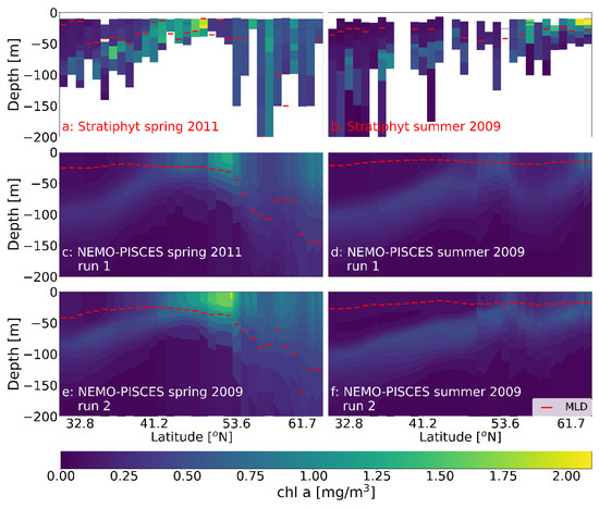 Chlorophyll a (Chl a) in the upper 200 m and mixed layer depth (MLD, red bars) of Stratiphyt (a,b), NEMO-PISCES (nucleus for European modelling of the ocean - pelagic interactions scheme for carbon and ecosystem studies) run 1 (c,d), and NEMO-PISCES run 2 (e,f) during spring (a,c,e) and summer (b,d,f). Model Chl a and MLD are April–May (spring) and July–August (summer) averages.