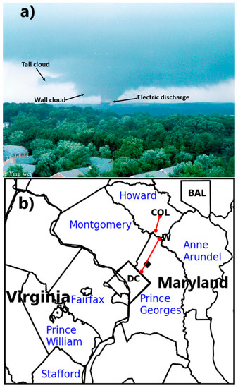 The College Park tornado produced heavy damage from just west of the campus of University of Maryland to downtown Laurel (Figure 1a,b). On and near the campus, the tornado caused approximately $15 million in damage, including 10 destroyed trailers (used as temporary facility for the Maryland Fire and Rescue Institute), several heavily damaged buildings, many tossed and destroyed vehicles, and two fatalities. It then struck the US Department of Agriculture Research Center, causing an estimated $41 million in damage to buildings and research documents. It continued north through Beltsville (5 km northeast of College Park), damaging homes, businesses, and schools. In downtown Laurel, the tornado tore the roof off a wing of the Laurel High School and then destroyed a single-level house in the neighborhood behind the school. Moving from Prince Georges County into Howard County, the tornado caused damage to 43 homes before finally dissipating in Columbia. Overall, $16 million in damage resulted in Prince Georges County that included 861 residential homes, 560 vehicles, and at least 23 commercial businesses. Approximately an additional $1 million in damage was caused in Howard County. The total damage in Maryland was estimated to be over $73 million (National Weather Service 2001, available online at https://www.weather.gov/lwx/stormdata) [1].