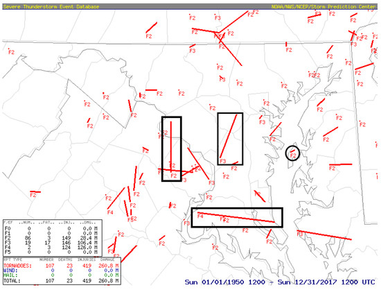 Plot of significant tornado tracks over Maryland and the greater Washington, DC, metropolitan area between 1950 and 2017. The track of the College Park tornado, as well as other recent long-track tornadoes in Fairfax County, Virginia, and Charles County, Maryland, are outlined by black rectangles, while the track of the 2017 Kent Island tornado is outlined by a black circle. Courtesy of the National Weather Service/Storm Prediction Center.