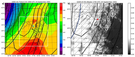 (a) The National Centers for Environmental Prediction Final (NCEP FNL) analysis-generated 1000 hPa equivalent potential temperature (θe, contoured at 4 K intervals) with overlying sea-level pressure (hPa, solid) at 1800 UTC; and (b) sea-level pressure (hPa, solid) and 500 hPa geopotential height (m, dashed) overlying GOES-8 visible albedo imagery over the mid-Atlantic coastal region at 1745 UTC 24 September 2001. A white rectangle marks the boundaries of the visible image in (b). The white closed curves in (b) mark the location of enhanced cumulus. Cyan (left) and red (right) dots indicate the location of College Park.