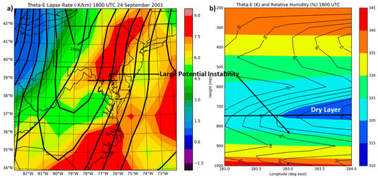 Figure 4b, a vertical cross-sectional image over the greater Washington, DC, metropolitan area, indicates the presence of high-θe air (i.e., θe > 335 K) in the lowest 100 hPa layer in the warm sector, anticipating the generation of intense convection when this high-θe air is lifted at the frontal boundary or convectively generated cold outflows. Thus, the supercell storm that would eventually produce the College Park tornado was predominantly “fed” by the positively buoyant high θe air [6]. Note that the low-level southerly flow overlain by strong southwesterly flow aloft indicated the presence of strong directional wind shear that was to be a major contributor to the development of storm rotation and the favorability for splitting supercell storms, as mentioned in Section 1.