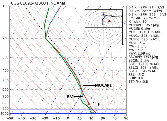 Figure 5 shows the FNL analysis-generated sounding at 1800 UTC over College Park, three hours prior to the arrival of the supercell storm. The FNL generates a marginal elevated mixed layer (“EML”; Banacos and Ekster 2010) [9] between 600 and 750 hPa, in which the temperature lapse rate was greater than moist adiabatic, while the dew point curve was nearly parallel to a saturation mixing-ratio line. The EML above 750 hPa served as a cap to the southerly flow of high-θe air and potential instability (“PI”) and a source of higher-momentum, unsaturated air that could be ingested into the mid-levels of deep convective storms, as can be seen in Figure 5. This confirms the significance of a continued southerly supply of high θe air for a potentially unstable environment, given the presence of a deep shortwave trough to the west.