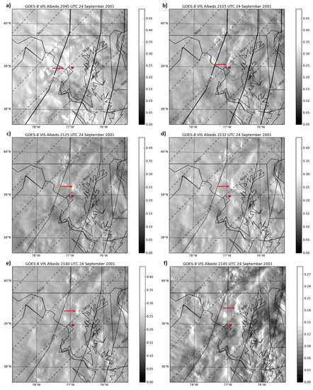 GOES-8 visible albedo imagery over the mid-Atlantic coastal region with overlying sea-level pressure (hPa, solid) and 500 hPa geopotential height (m, dashed) at (a) 2045 UTC; (b) 2115 UTC; (c) 2125 UTC; (d) 2132 UTC; (e) 2140 UTC; and (f) 2145 UTC 24 September 2001. The red arrows mark the location of the College Park supercell.