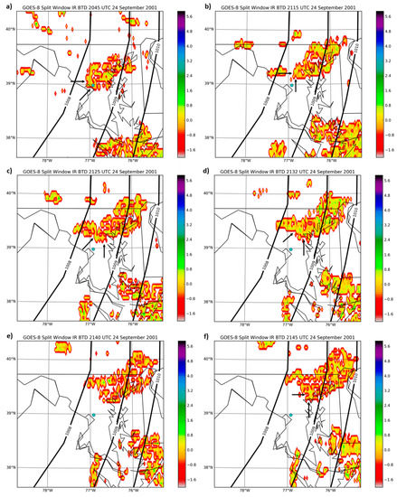 The GOES-8 infrared window channel imagery shown in Figure 7 also tracked important features of the College Park supercell during the time of development and evolution of the tornado. Specifically, the GOES-8 split window (channel 4–5) brightness temperature difference (BTD) imagery (Inoue 1987) [11] at a 4 km resolution, with a convective storm cloud mask applied that removed cirrus and warm, low-topped cumulus clouds, displayed a high level of detail in storm structure. This derived product was effective in identifying storm-scale features, including rough edge texture apparent as indentation on the southern and southwestern flanks of the storm during the tornadogenesis period, 2045 to 2125 UTC (marked by black arrows in Figure 8a–c). The BTD imagery was compared to NEXRAD reflectivity imagery, shown in Figure 8 and Figure 9, to demonstrate that near zero or slightly negative BTD values were associated with high radar reflectivity (>50 dBZ), and a series of notches on the southwestern (rear) periphery of the supercell storm was possibly associated with the mid-tropospheric intrusion of high momentum, unsaturated air into the precipitation core of the thunderstorm. This correspondence was especially apparent during the early part of the tornado’s track from College Park to Laurel. Facilitated by strong southwesterly winds of 20 to 25 m s−1 (40 to 49 kt) in the EML, as displayed by the hodograph in the sounding profile, the interaction of unsaturated environmental air with the heavy precipitation core likely provided downdraft energy for intense storm outflow winds that initiated and sustained the tornado. Markowski (2002) [13] reviewed the physical processes of RFD generation, the role of the RFD in the acceleration of the RF gust front, and the generation and enhancement of vertical vorticity at the interface between the RFD and rotating updraft. The combined effect of these processes results in the intensification of a low-level mesocyclone and subsequent tornadogenesis.
