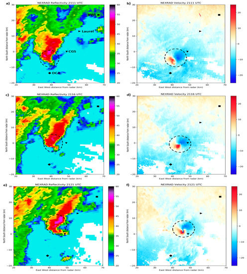 Sterling, Virginia, 0.5° WSR-88D (NEXRAD) radar reflectivity factor (dBZ) and radial velocity (m s−1), respectively, on 24 September 2001 at (a–b) 2111 UTC; (c–d) 2116 UTC; and (e–f) 2121 UTC. Black diamonds, inverted triangles, right-pointing triangles, and squares mark the locations of Reagan (Washington) National Airport (“DCA”), College Park Airport (“CGS”), Laurel severe wind report, and Baltimore-Washington International Airport (“BWI”), respectively. Black dashed, closed curves mark the location of the parent supercell in the reflectivity factor imagery and the tornado signature (velocity couplet) in the radial velocity imagery.