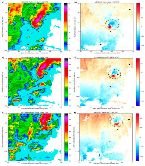 Burgess et al. (2002) [17] defined the quantity of Delta-V as the TVS velocity difference (or storm-relative velocity). This strong correspondence could be well demonstrated in the present case. As displayed in Figure 8d, by 2116 UTC, the Delta-V had rapidly exceeded 40 m s−1 (80 kt) as the tornado was developing southwest of College Park and then continued to increase to near 50 m s−1 (100 kt) by 2121 UTC as the tornado reached F3 intensity (Figure 8f). A Peak Delta-V of greater than 50 m s−1 was observed at 2126 UTC (Figure 9b) as the tornado was tracking rapidly northeastward toward Beltsville. After 2130 UTC, Delta-V decreased to 40 m s−1 as the intensity of the tornado weakened to F2 (Figure 9d). By 2146 UTC (Figure 9f), the tornado, moving northeast toward Columbia, was near the end of its lifetime and its intensity had decreased to F1. Consequently, Delta-V decreased significantly to 40 m s−1. It was also observed that as the tornado intensified from F1 to F3, the TVS moved from a location on the left-front quadrant of the hook to the center of the TDS.