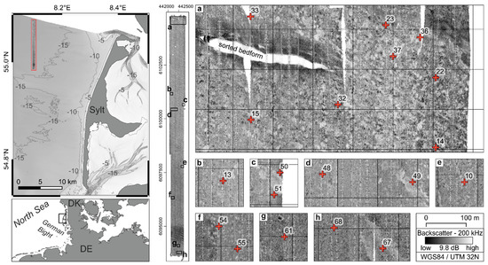 The study area is located 17.5 km offshore Sylt island in the German Bight (Figure 1) at a water depth of approximately 15 m. The region is exposed to storm events from the west and influenced by semidiurnal tides that are flood dominated. The seafloor surface and subsurface of the area have been described as homogenous sandy surfaces by [14,31,32]. A backscatter map of the study site reveals numerous patchy features. The benthic community is mainly characterized by endobenthic species with few structures protruding from the sediment surface. The most prominent structures are tubes constructed by the sand mason Lanice conchilega. The endobenthic community inhabiting the fine sands can be assigned as Tellina-fabula assemblage [33], whereas medium and coarse sands are colonized by a typical Goniadella-Spisula assemblage [34]. While attached epifauna is scarce, mobile epifauna is dominated by echinoderms (mainly starfish and brittlestars). Mostly due to high wave energy frequently reaching the seabed, density and species richness are reduced compared to deeper parts of this area [34].