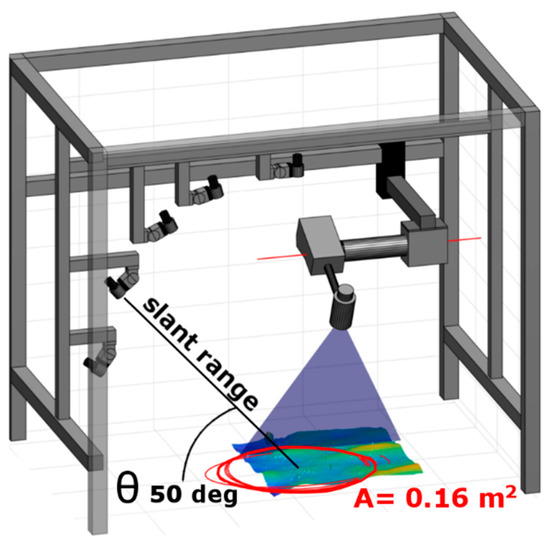 For the acoustic experiment, five planar transducers (Benthowave Instruments Inc., Collingwood, ON, Canada) were fixed to the lander frame (Figure 2). The transducers have different incidence angles and slant ranges with a common footprint center and a constant acoustic footprint of ~0.25 m2. For this study, we focus on the transducer mounted at a grazing angle of 50° because backscatter intensities recorded at grazing angles between 30° to 60° are less responsive to slight changes in grazing angle [21]. The chosen footprint size of 0.16 m2 at an angle of 50 degrees corresponds approximately to the footprint size of a single beam of a multibeam system. The acoustic footprint is located within the area captured by the laser scanner. Recording windows of the transducers were adjusted to avoid multiple reflections, system reverberation, and nearfield effects. To improve the signal-to-noise ratio at each shot, 20 time series were logged and stacked during post-processing. For transmitting, a driving voltage of 80 V generated a 102 µs linear chirp pulse signal with a bandwidth range of 80 to 310 kHz. For receiving, the sampling rate was set to 10 MHz. The time-varying response function (TVR) and the oscillation circuit voltage (OCV) were provided by the manufacturer to convert the recorded voltage into an acoustic signal. The TVR describes the frequency-dependent relationship between the transmitted signal amplitude at a 1 V driving voltage and the pressure change at a one-meter distance in µPa. The OCV describes the frequency-dependent amplitude conversion of a 1 µPa pressure field into a voltage response. TVR and OCV are defined for the transducer center frequency at 194 kHz (wavelength 7.73 mm), with amplitudes strongly decreasing for both higher and lower frequencies. Because the transducer-specific response function could not be accurately measured, a constant transducer configuration ensures a comparable signal between the stations for each grazing angle. To ensure no reflection or scattering effects caused by the lander frame or optic unit occurred, the system was tested while elevated in the water column.