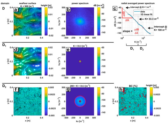 Computed amplitude values in the frequency domain are displayed as their common logarithm multiplied by ten. The radial averaged psdK is used to derive interface roughness parameters in the form of the spectral slope (γ2) and spectral intercept (ω2). The parameters “spectral slope,” which describes the slope of a linear fit, and “spectral strength,” which describes the intercept of the linear fit at a certain spatial wavelength, were calculated as described by references [24,37] and are outlined in Figure 3c. For acoustic modeling, the spectral strength is extrapolated to a spatial wavenumber of K = 1 m−1 [5], which corresponds to a wavelength of 1 m. Details on the used acoustic model are given in Appendix A. Additionally, for comparison with past studies of seafloor roughness [6], the spectral strength was computed at a spatial wavenumber of K = 100 m−1, which corresponds to a wavelength of 0.01 m.
