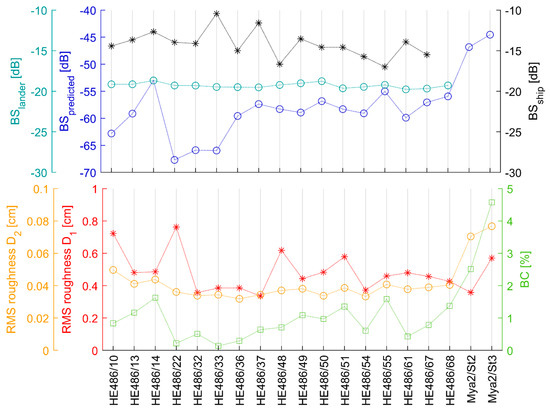 Backscatter strength data recorded by the lander system at 50° show a range of 1.1 dB with a mean value of −19.3 dB (σ ± 0.3 dB). The amplitude values are displayed in Figure 4. No lander-based backscatter data exist for the Mya cruise 2016 because the system was not fully operational at that time. The lander backscatter values recorded during the HE486 cruise show no correlation with the RMS roughness and a moderate correlation with the traced benthos parameters (Table 1). The backscatter values predicted by the small-roughness perturbation approximation are displayed in Figure 4 and were used for a model/data comparison. Between all stations, the predicted backscatter strength shows a range of 23.2 dB with a mean value of −58.0 dB (σ ± 5.7 dB). Excluding stations with unavailable lander backscatter data, the difference in backscatter strength decreases to a range of 14.7 dB with a mean strength of −59.7 dB (σ ± 4.0 dB). The predicted backscatter during the HE486 cruise shows an insignificant weak correlation with the RMS roughness of any domain and a strong correlation with the traced benthos parameters (Table 1). No correlation was observed between the ship-based BS values and the parameter obtained by the lander system (Table 1).