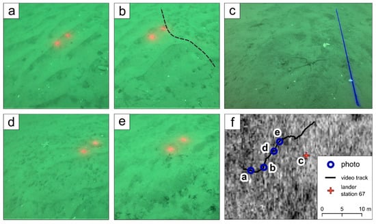Video footage from a survey near station 63_1 (a), (b), (d), (e) (red dots have a 10 cm distance), from the lander station 67 (c) and the corresponding position in the ship-based backscatter mosaic (f). (a) reveals asymmetrical straight to sinusoidal ripples with sparse benthic coverage and organic fluff located inside the ripple troughs. (b) indicates the transition is between the ripple-dominated and the benthic-dominated seafloor type. In (c), degenerate ripple structures were observed with few tubeworm structures, shell fragments, and brittlestars (Ophiuroidea). (d) reveals degraded ripple residuals and a higher coverage of tubeworm structures, few starfish, and larger shell fragments. The morphology in (e) shows no ripple structures and very few visible epibenthic features besides some organic fluff. The ship-based backscatter mosaic in (f) shows a corresponding change from low to high backscatter along the video track. However, the positioning is not sufficiently accurate to relate video snapshots directly to the backscatter mosaic.