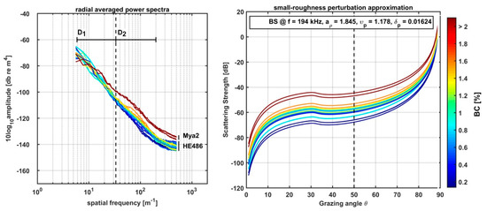 Left hand side psdK over all lander stations. The vertical dashed line indicates the cutoff frequency (K = 33 m−1) between the D1 and D2 domain. The color shows the corresponding benthic coverage. High RMS roughness values in the D2 domain correlate with high benthic coverage. Right hand side, backscatter strength predicted by the small-roughness perturbation approximation given by reference [6] for the lander sites with acoustic data.
